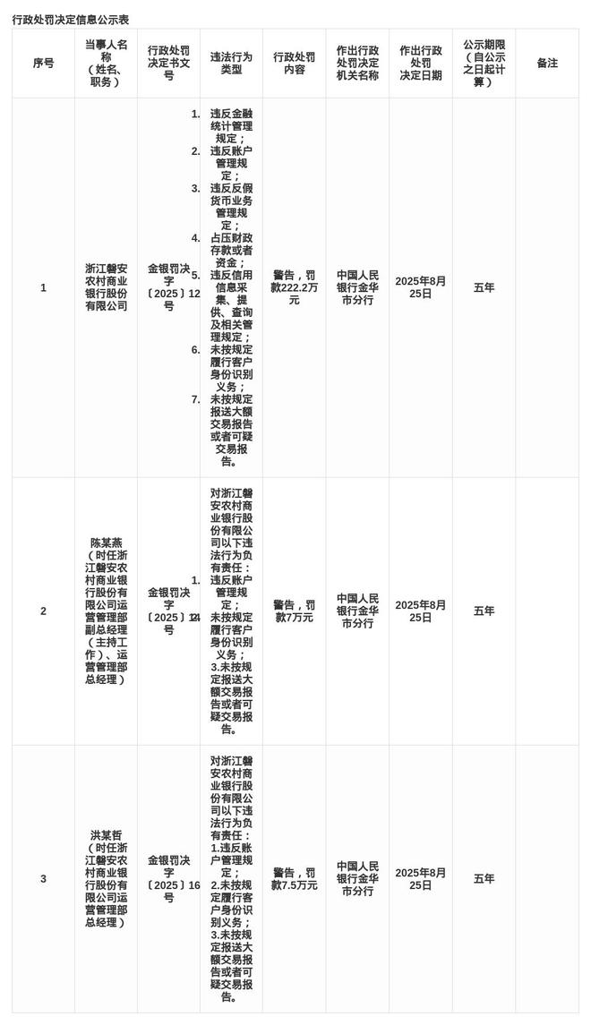 浙江磐安农商行遭罚款222.2万,涉及多项违规行为