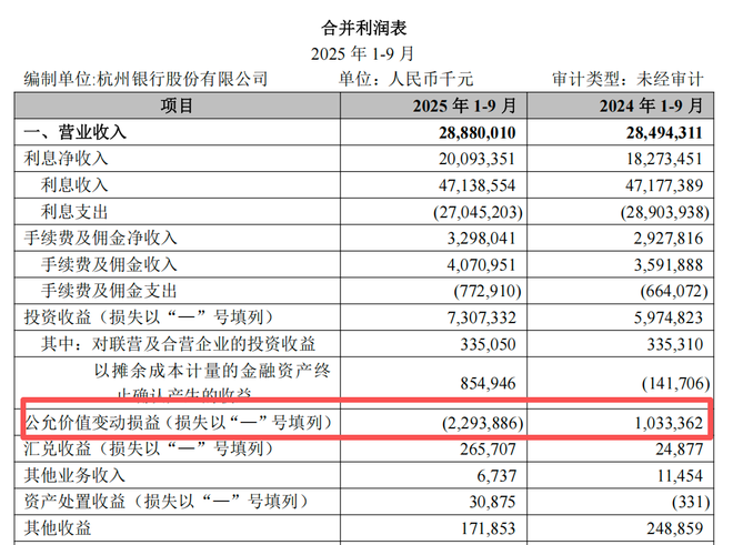 营收下滑主要来自非息业务的影响。受去年债市利率上行影响,债券估值收益缩水,杭州银行前三季度公允价值变动损益为-22.94亿元,而2024年同期为正收益10.33亿元。