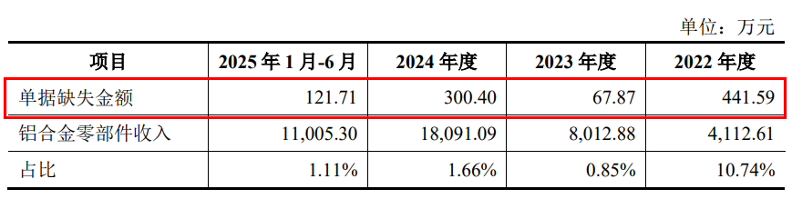 报告期内,隆源股份主营业务收入中对应单据存在缺失或缺少签字的金额分别为1062.73万元、1223.57万元、893.18万元和353.76万元。同期,铝合金零部件产品收入确认存在少量单据缺失的情形,金额为441.59万元、67.87万元、300.40万元和121.71万元。