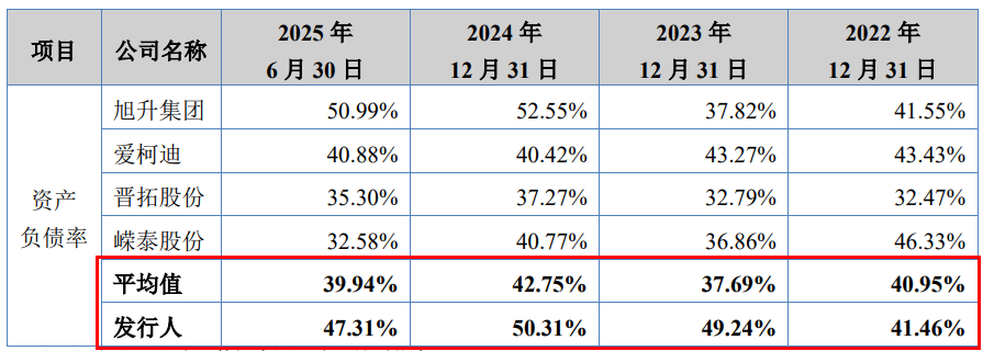 报告期内,隆源股份的资产负债率分别为41.46%、49.24%、50.31%和47.31%;同行可比公司的资产负债率均值分别为40.95%、37.69%、42.75%和39.94%,低于隆源股份。