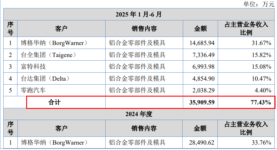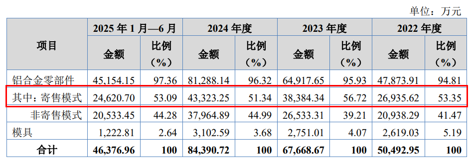 铝合金零部件是主要收入来源,占公司主营业务收入的比例在九成以上。其中,2022年至2025年上半年(以下简称“报告期”),汽车类零部件的销售金额占主营业务收入的比例则高达88.78%、92.04%、94.55%和95.42%。