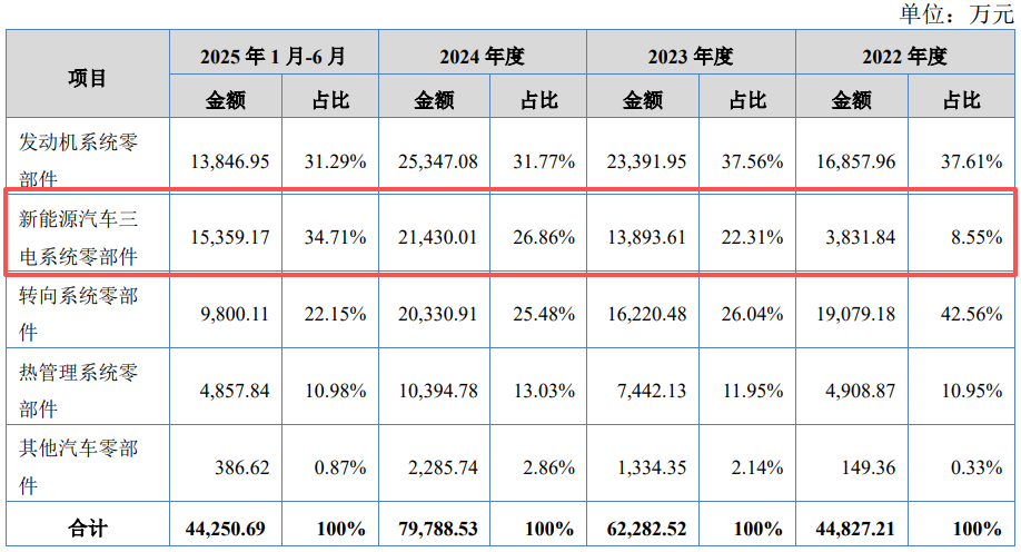 报告期内,新能源汽车三电系统零部件销售金额分别为0.38亿元、1.39亿元、2.14亿元和1.54亿元,销售占比从2022年的8.55%激增至2025年上半年的34.71%。