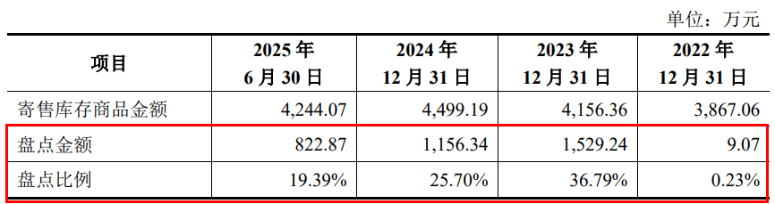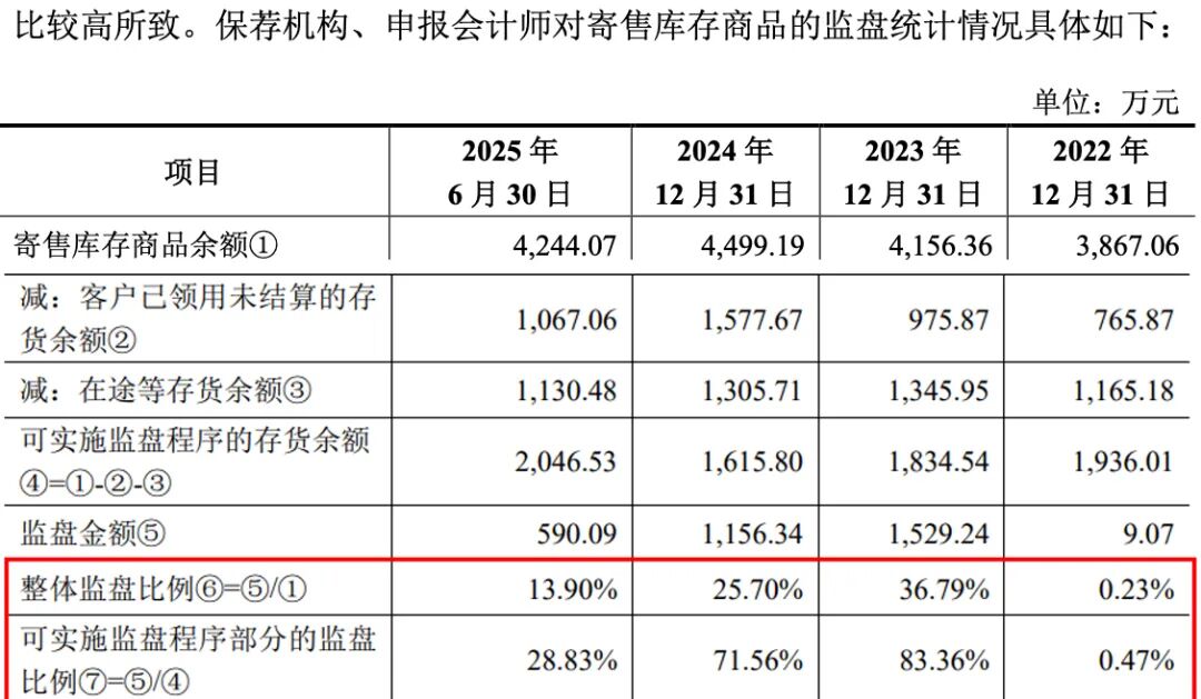 然而,剔除上述寄售库存商品余额后,国金证券对各期末可实施监盘程序寄售库存商品的监盘比例分别为0.47%、83.36%、71.56%和28.83%,在2022年末和2025年6月末同样偏低。