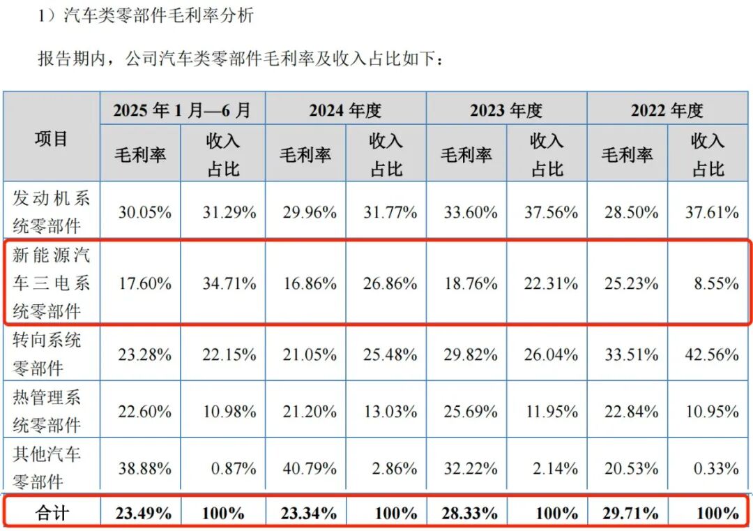 其中,新能源汽车三电系统零部件毛利率分别为25.23%、18.76%、16.86%和17.60%,低于公司其他产品的毛利率水平,且整体处在下滑趋势。