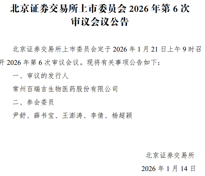 北交所官网1月14日信息显示,北交所上市委员会定于2026年1月21日上午9时召开2026年第6次审议会议,审议常州百瑞吉生物医药股份有限公司(以下简称百瑞吉)的IPO申请。