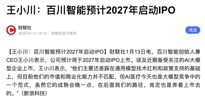 百川智能创始人、CEO王小川日前就对媒体回应称,"AI医疗需要晚一些,也会走到上市的路径。""在上市层面,207年会有动作。"