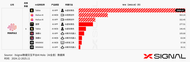 AI领域知名数据分析机构Xsignal发布的AI创业公司App月活数据显示:截至2025年11月,智谱的智谱清言App月活为121.26万,网页月活为172.11万,海外z.ai为265.32万,加起来为560万;MiniMax App为57.99万,网页为30.31万,共计不到90万。