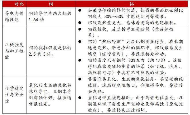 铜在导电性、耐用性、安全性等多方面具备显著优势,但铝在轻量化及性价比方面具有自身独特的优势。