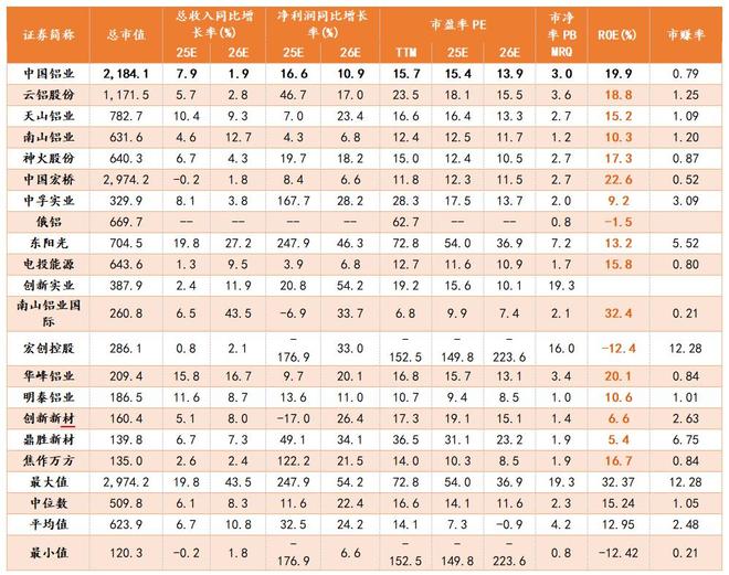 ROE居前的是南山铝业、华峰铝业、中国宏桥、中国铝业等。
