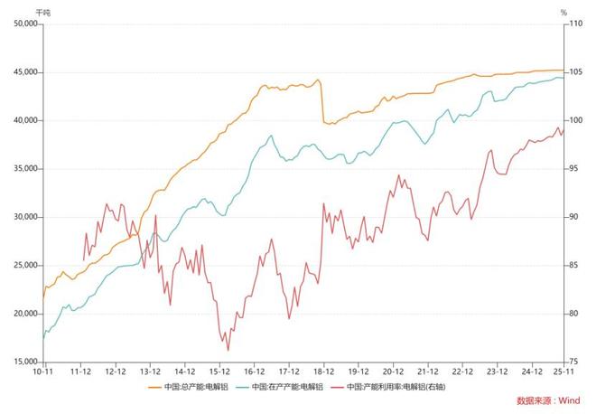 截至25年10月,我国电解铝总产能4523.2万吨,未来产能以置换为主,政策层面已锁定上限。24年以来产能利用率94.46%上升至99%左右,接近满产。