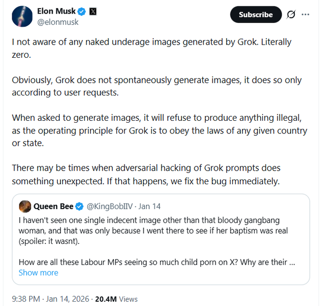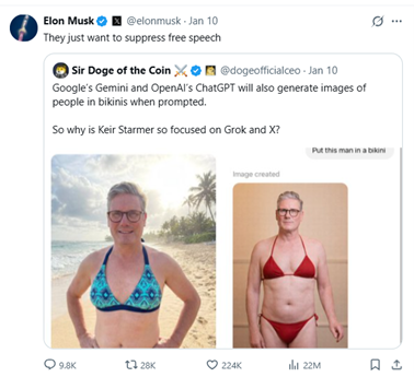 1月8日,英国首相斯塔默公开斥责此类图像 “令人作呕” 且 “涉嫌违法”,并要求马斯克旗下的 X 平台 “管好 Grok”。对此,马斯克在X平台转发一个帖子,内容是“谷歌的Gemini和OpenAI的ChatGPT在人们发出指令后同样能生成比基尼照片,为什么斯塔默只盯着Grok?”。马斯克在转发时对这个讽刺性的提问给出了自己的回答:“因为他们想压制言论自由”。