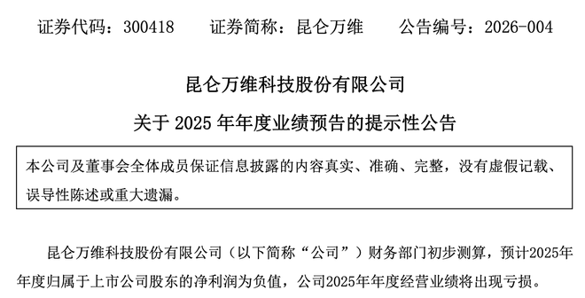 1月15日,昆仑万维(300418)公告,公司财务部门初步测算,预计2025年度归属于上市公司股东的净利润为负值,公司2025年度经营业绩将出现亏损,具体金额暂未透露。
