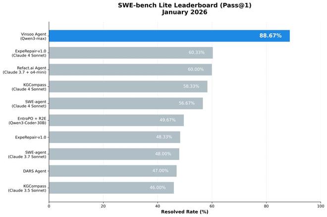 据了解,在近日即将发布的AI编程智能体榜单(SWE-bench 相关测评)中,其凭借自研的Vinsoo 3.0云端Agent,在没有任何人类干预的前提下,不仅大幅超越了硅谷的一众独角兽,更在复杂任务处理成功率上刷出了世界第一的SOTA效果。