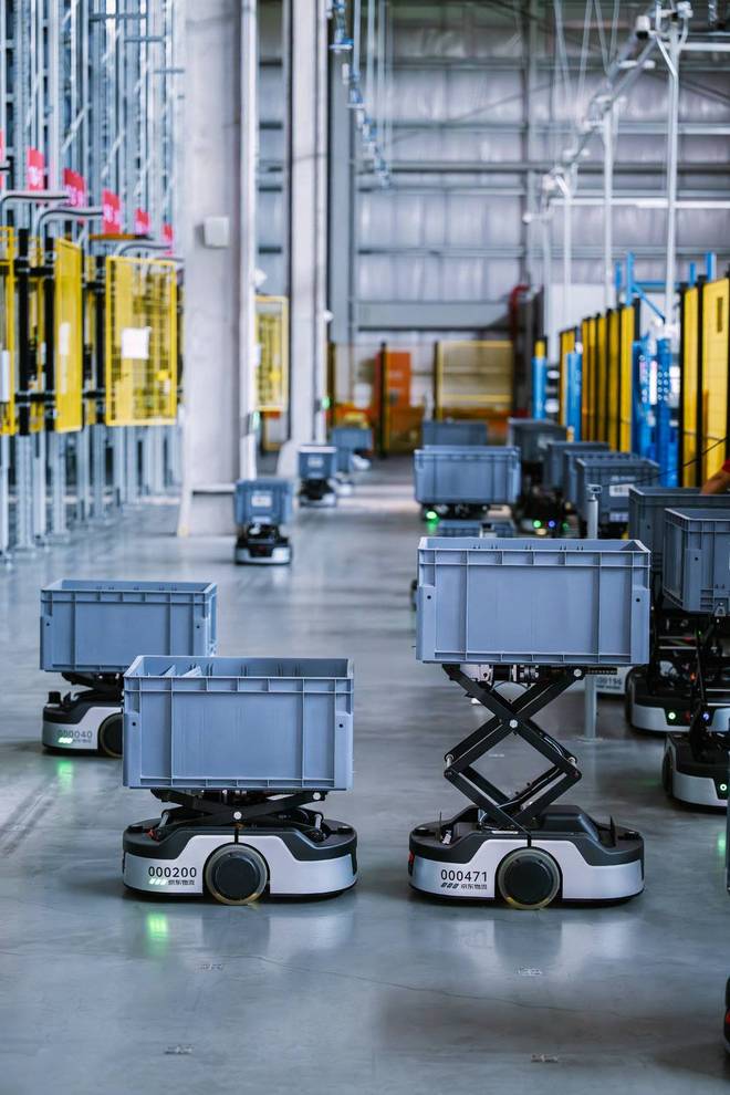 作为京东物流在英国布局的自动化标杆仓库,这一智狼仓占地面积超3000平方米,内部部署近200台智狼机器人。得益于这些智能设备的高效运转,该仓库拣货及出库效率实现约4倍的大幅提升。