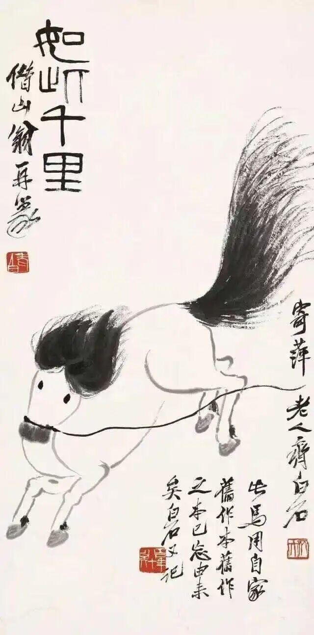 《如此千里》便是“十二属图”中的一件。十二属就是十二生肖,当年关蔚山想请齐白石画一组十二生肖图,但齐白石轻易不画自己没见过的事物——比如龙——最初没有答应。但关蔚山很有耐心,一口气求不来,他就每年向齐白石求两三张生肖画,花了四年时间终于集齐。