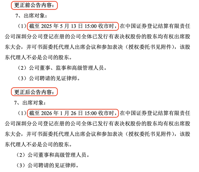 根据更正公告,相关时间节点应为“截至2026年1月26日15:00收市时”,趣睡科技却误写成了“截至2025年5月13日15:00收市时”。