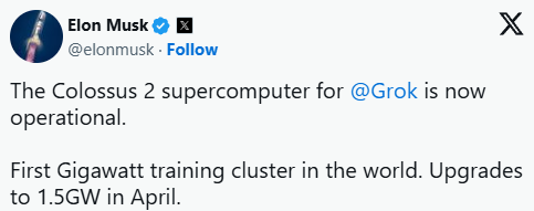 全球首个GW级算力集群震撼上线,Colossus 2投入运行,xAI展现惊人速度!