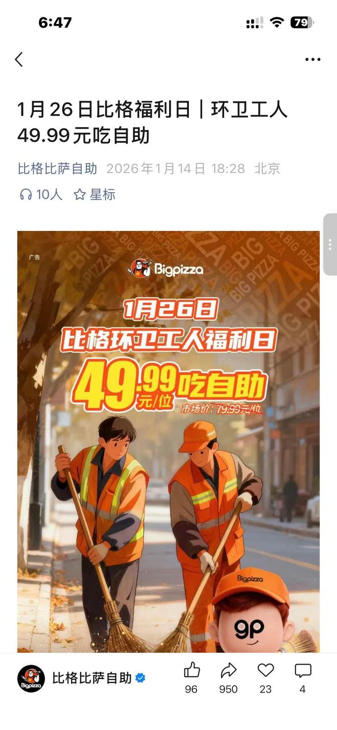 1月14日晚间,连锁餐饮品牌比格比萨推出"环卫工人福利日"活动。据其发布的相关宣传海报,活动定为1月26日国际清洁能源日当天,环卫工人凭工作证或身着工作服到店,可享49.99元/位的自助优惠,市场价为79.99元/位。