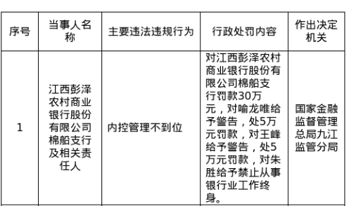 江西彭泽农商行棉船支行因内控管理不到位被罚款30万