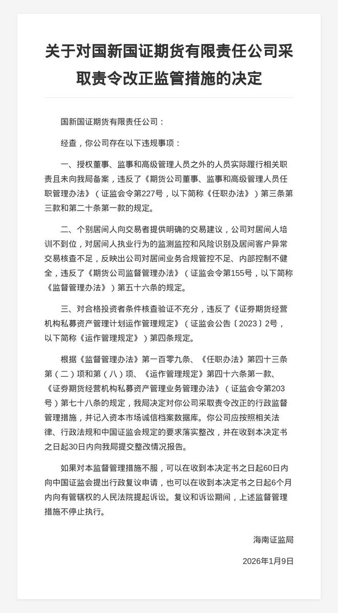 蓝鲸新闻1月17日讯,近日,海南证监局发布行政监管措施决定书,剑指国新国证期货有限责任公司。