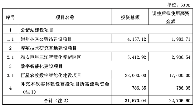 调整后,募集资金将集中用于公猪站建设、养殖技术研究基地建设、数字智能化建设以及补充少量流动资金。