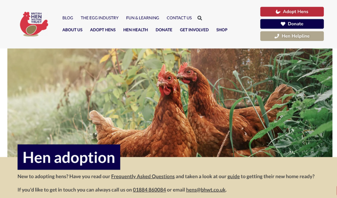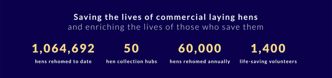 它是一个专注于鸡福利的慈善机构,专门从商业蛋鸡农场接走那些不再生蛋的母鸡,然后通过全国志愿者网络把它们安置到人类的家中,让它们过上更快乐的家养生活。