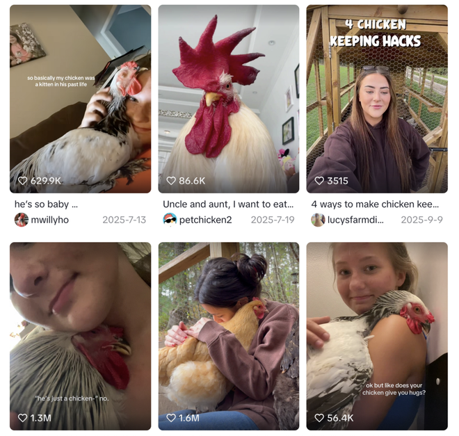 在TikTok和Instagram等平台上,#petchicken#chicken#chickensoftiktok等关于家养鸡的话题均有高达几十万的浏览量。无论是农场主还是都市白领,都开始在视频中一脸爱意地拥抱宠物鸡。