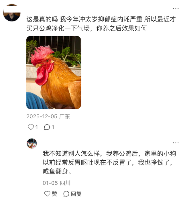 再加上不止一个网友在评论区亲身验证,自己在养鸡之后运气暴涨。不仅心情愉悦,信心大增,腰不疼不酸;还能助长财运,赚大钱,甚至让家里的小狗也身体棒棒。