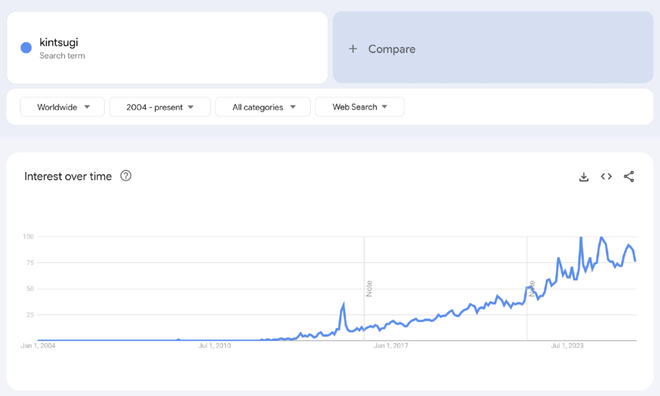 google趋势的走势显示金继与侘寂的概念在这两年搜索量飙升,尤其是在《乡巴佬希尔》那条视频在Tiktok上爆火之后,两个概念都在一起激增。