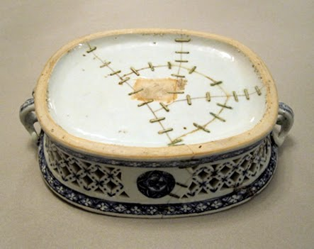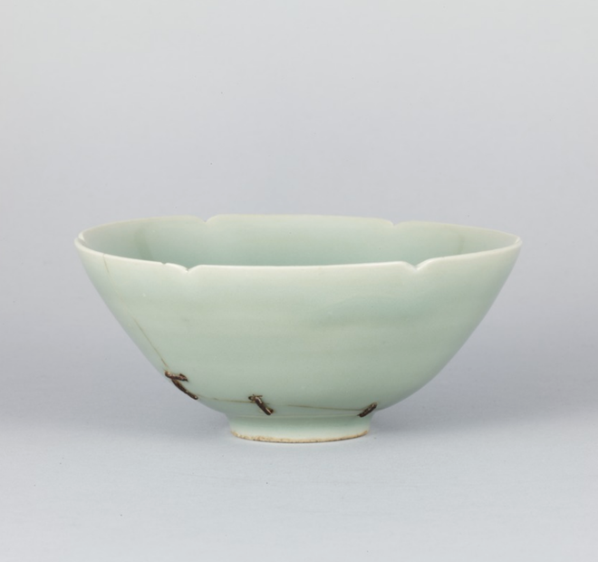 事情是这样,据说在明朝的时候,当时日本的幕府将军足利义政(1449~73)搞坏了一只龙泉青瓷茶碗,然后就送回中国修了,当时咱们这边的工匠也不含糊,直接拿金刚钻就往这碗来了几个锔钉,修好给送回去了。