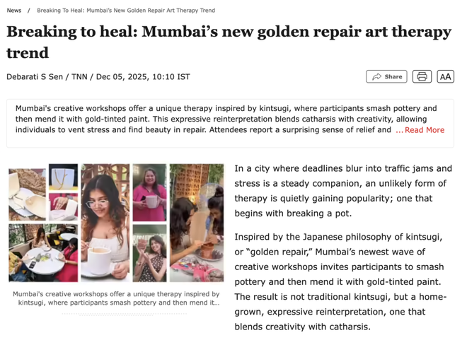 根据《印度时报》2025年12月5日的报道,孟买当地出现了一家以金继疗愈为主题的解压店铺。人们到店砸碎陶罐,然后再行金缮: