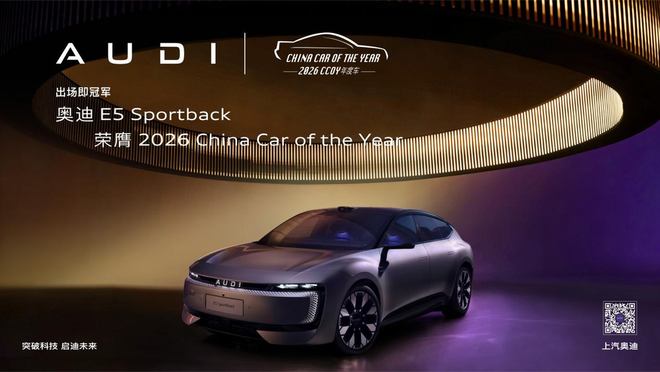 这一策略的有效性,在2026年开年的一场关键战役中得到了量化验证。1月8日,在行业公认的风向标——“2026 CCOY 年度车”评选结果中,奥迪E5 Sportback以 241分 的总成绩摘得桂冠。